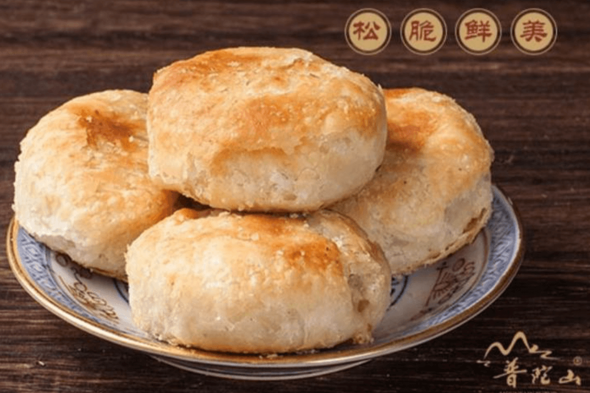觀音餅是在原來普陀山素餅制作工藝基礎(chǔ)上,以海苔,黑芝麻、花生、豆沙等為主要原料精制而成。成品色澤金黃,外酥里糯。