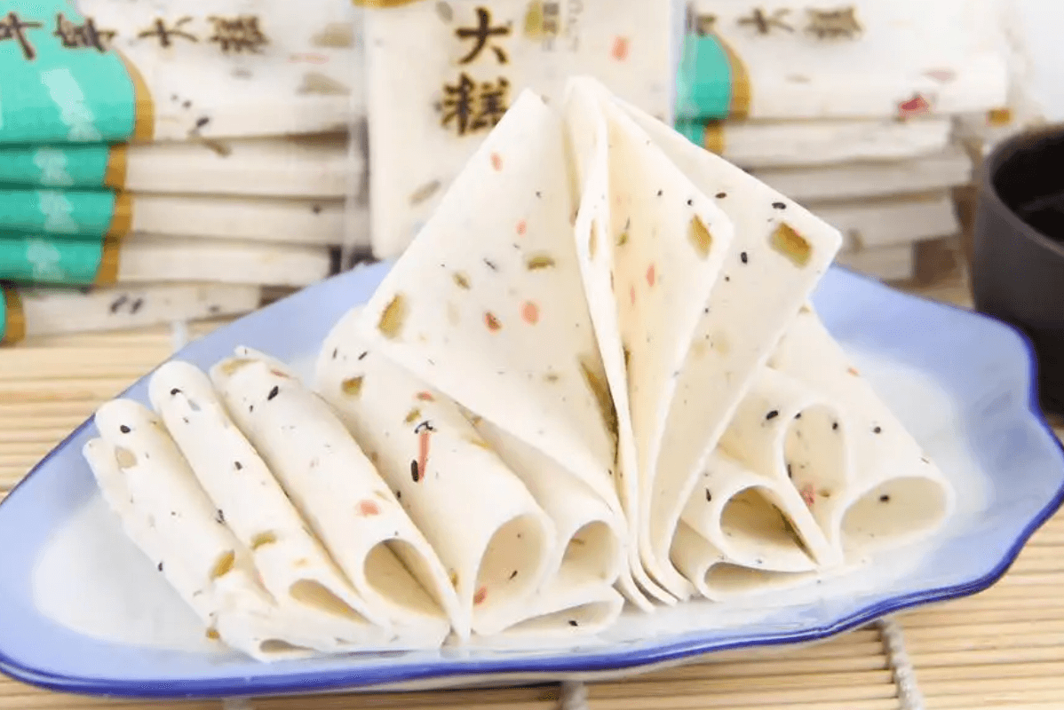 阜寧大糕又名玉帶糕,產(chǎn)于中國散文之鄉(xiāng)阜寧縣,糕片白如雪,柔如云,甜如蜜,薄如紙,單片可點燃,入口香甜。
