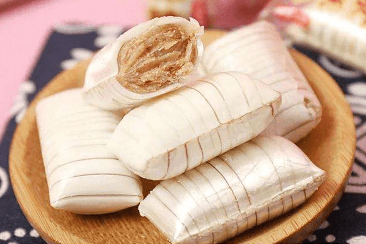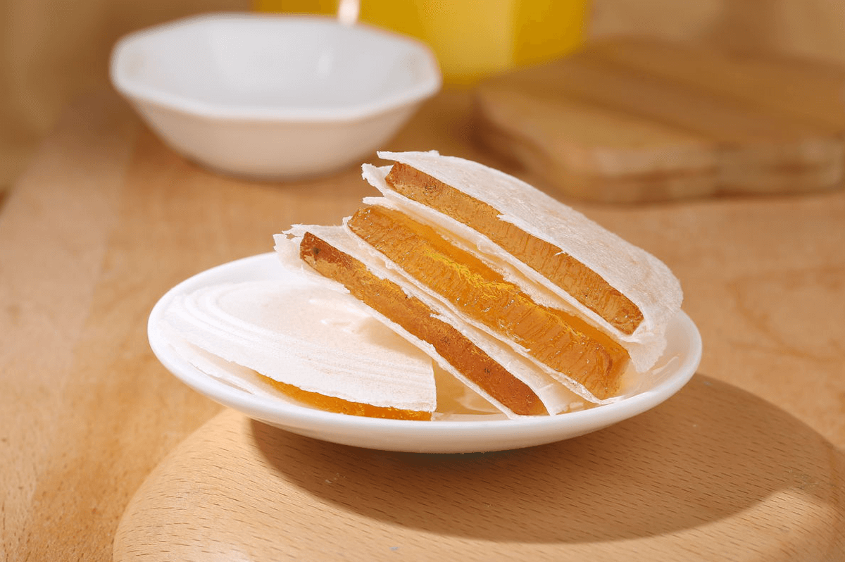 茯苓夾餅以茯苓霜和精白面粉做成薄餅,中間夾有用蜂蜜、砂糖熬溶攔勻的蜜餞松果碎仁,其形如滿月,薄如紙,白如雪,珍美甘香,風(fēng)味獨(dú)特。