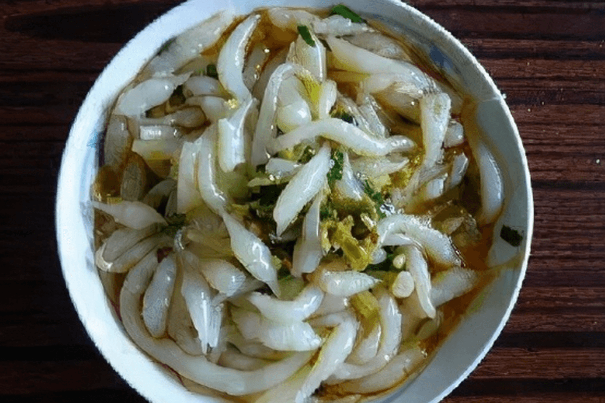 雙堆面魚并不是魚。因?yàn)閾艿藉伬锏囊粋€(gè)個(gè)面魚兒十分均勻,樣子都是一頭尖,確有幾分像小魚兒,所以人們以其形似,便把這種面食稱作“面魚”。