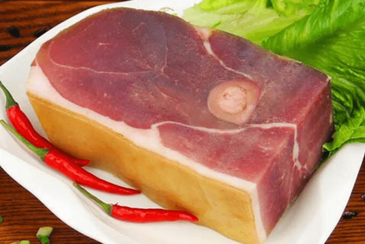 安?;鹜冗x用當(dāng)?shù)靥赜械陌哺C棕i的鮮后腿腌制而成。精肉鮮紅似火,肥肉潔白晶瑩,曾以“誘人之香,奪席之味”被列為宮廷貢品。
